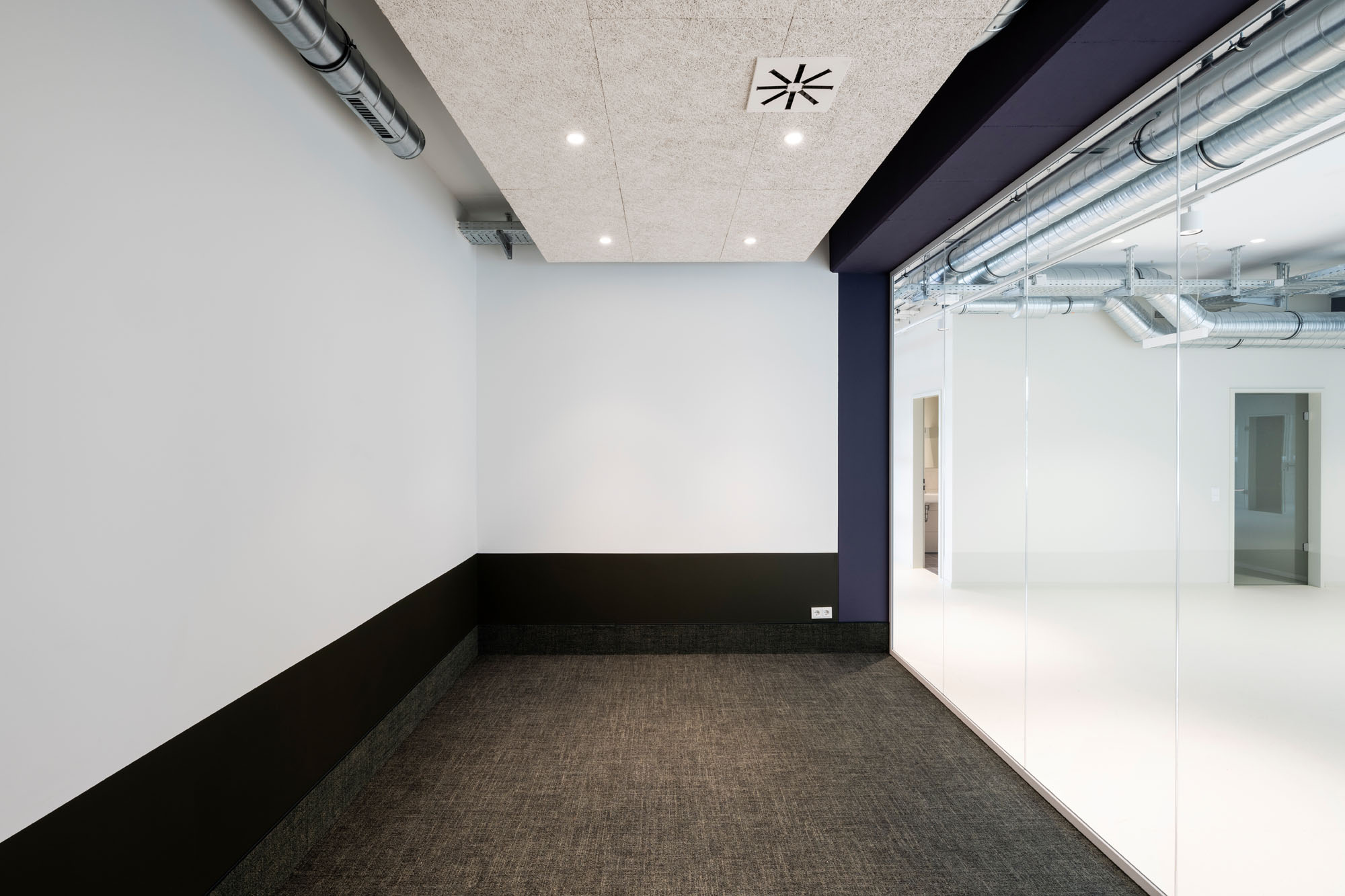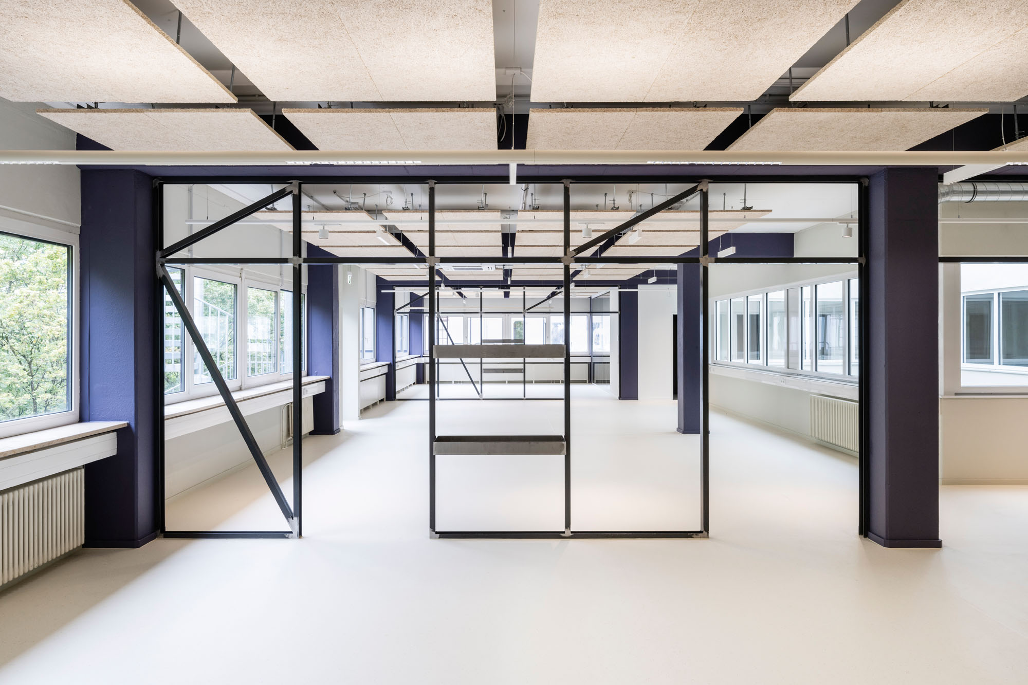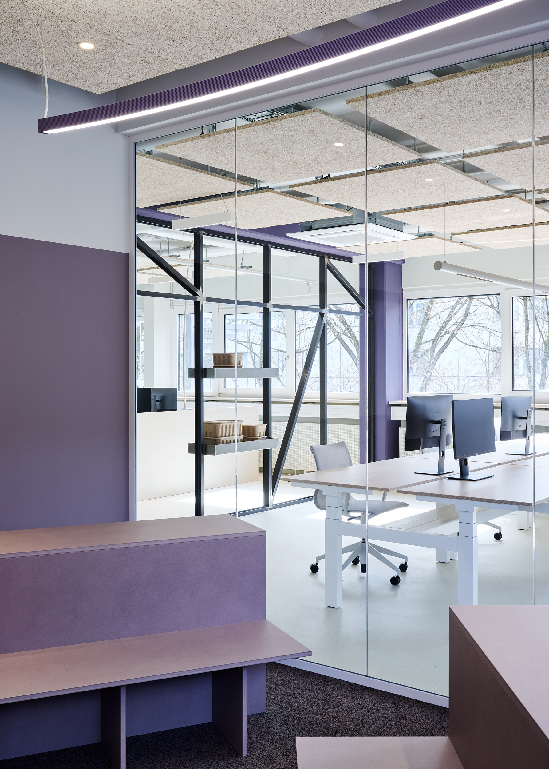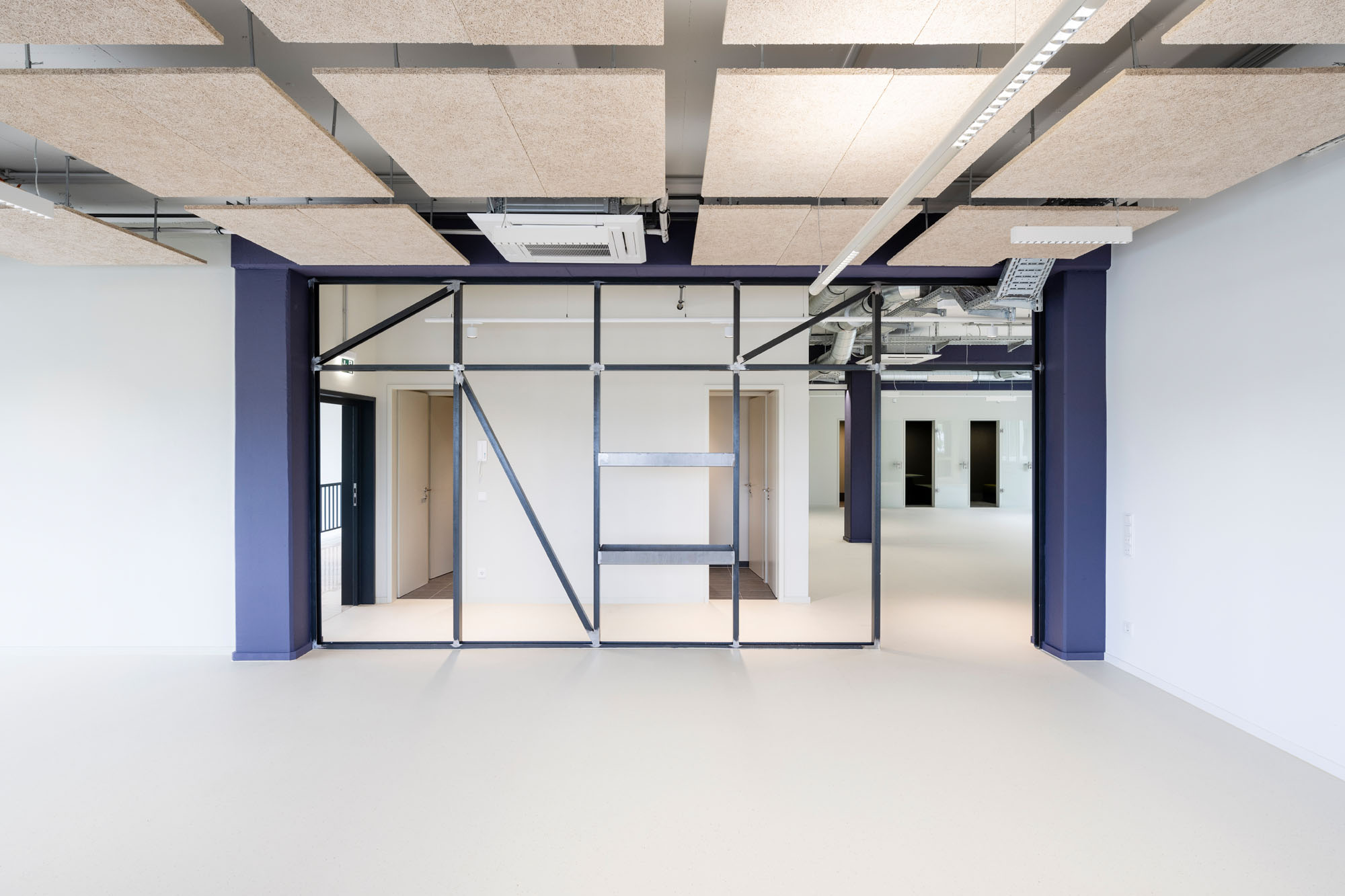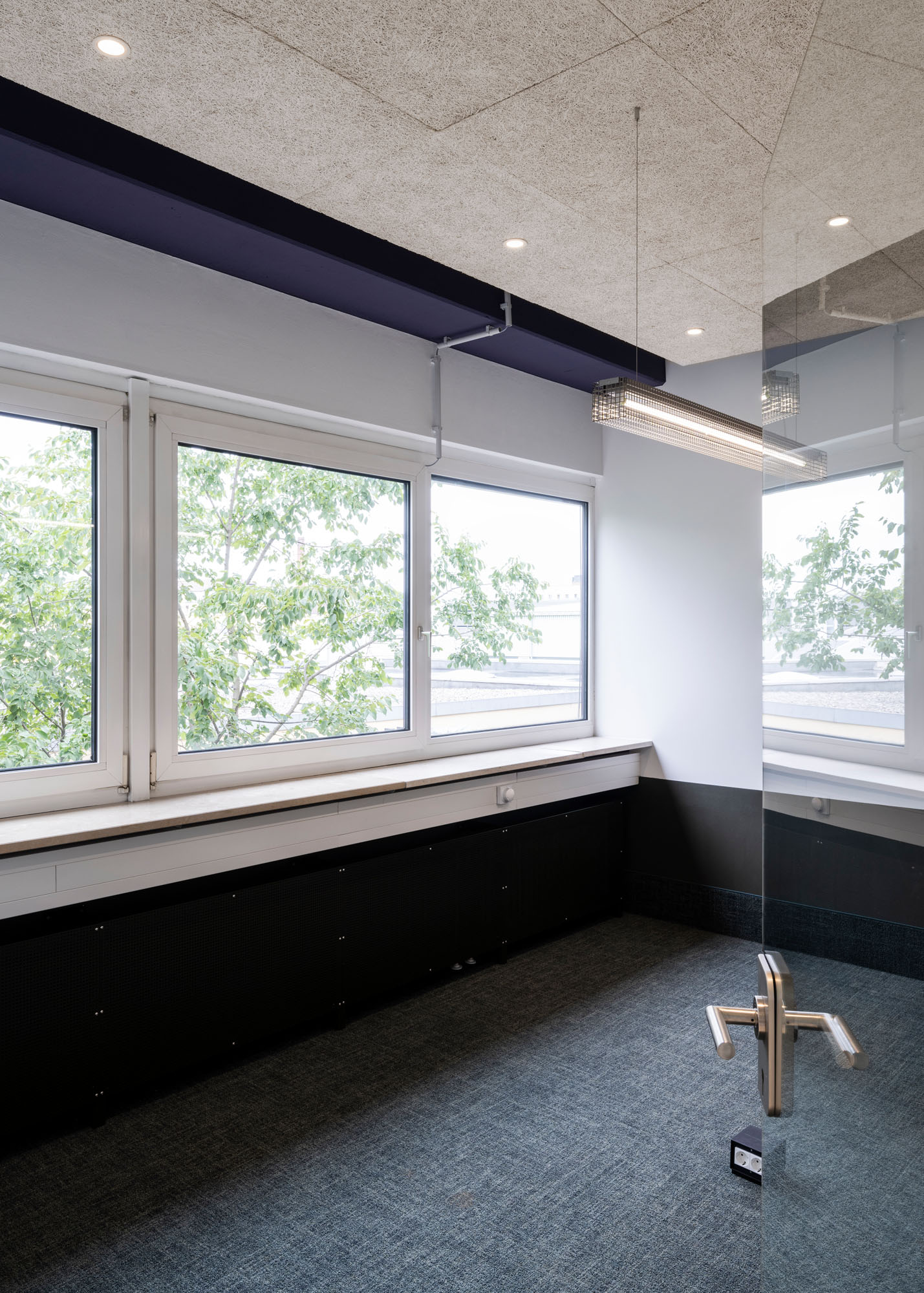 Stahl-Trennelemente strukturieren den Großraum und gliedern ihn in sinnvolle Einheiten. Open Space mit fließenden Übergängen zu den verschiedenen Arbeitsbereichen. Verschieden große und gestaltete Projekt- und Besprechungsräume. Rückzugsbereiche für konzentriertes Arbeiten – Think Tanks. Kreativ gestaltete Loungebereiche mit flexiblem Mobiliar. Große Fensterflächen und ein innenliegender Lichthof sorgen für viel Licht und angenehmen Arbeitsatmosphäre.
