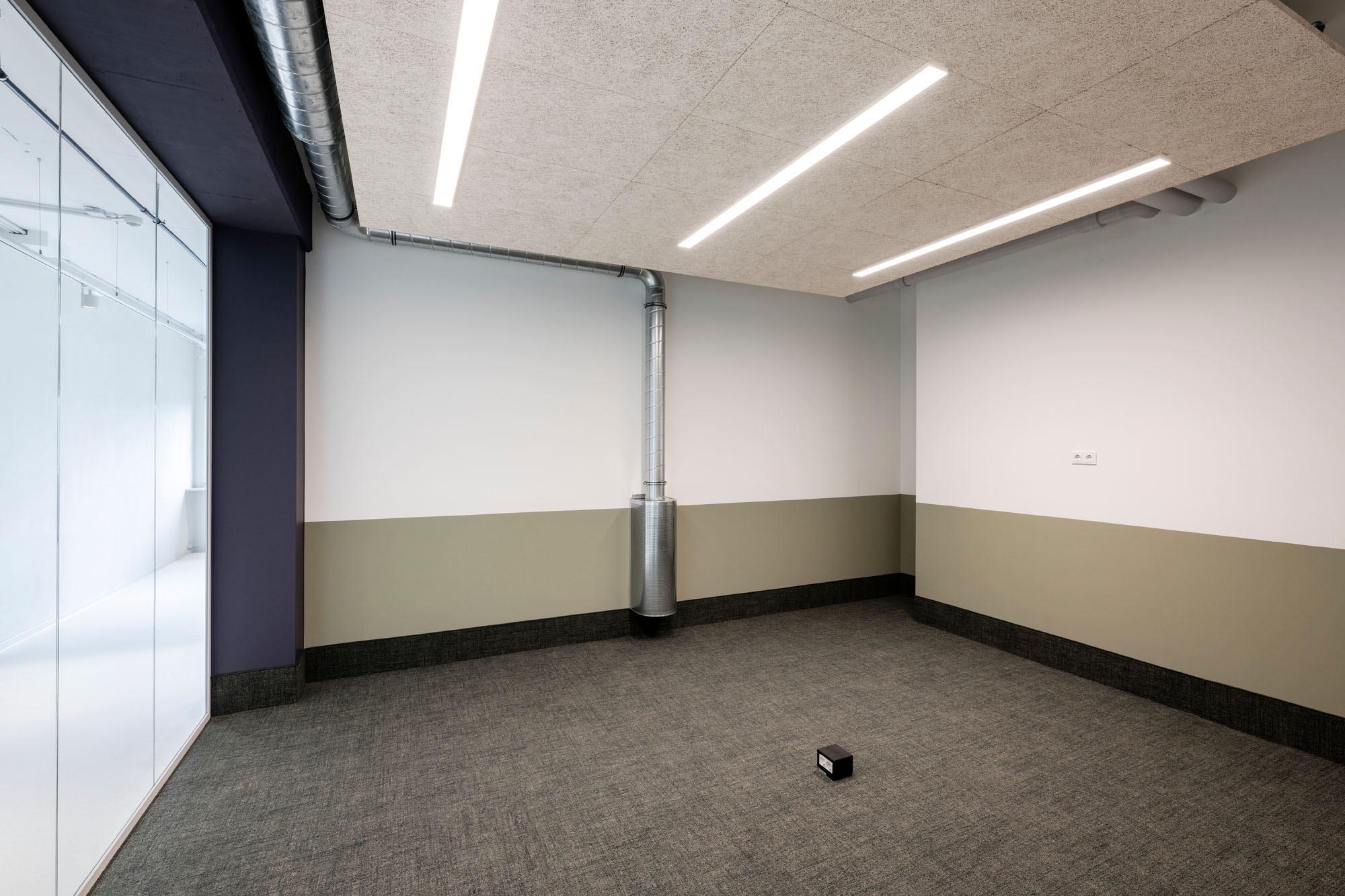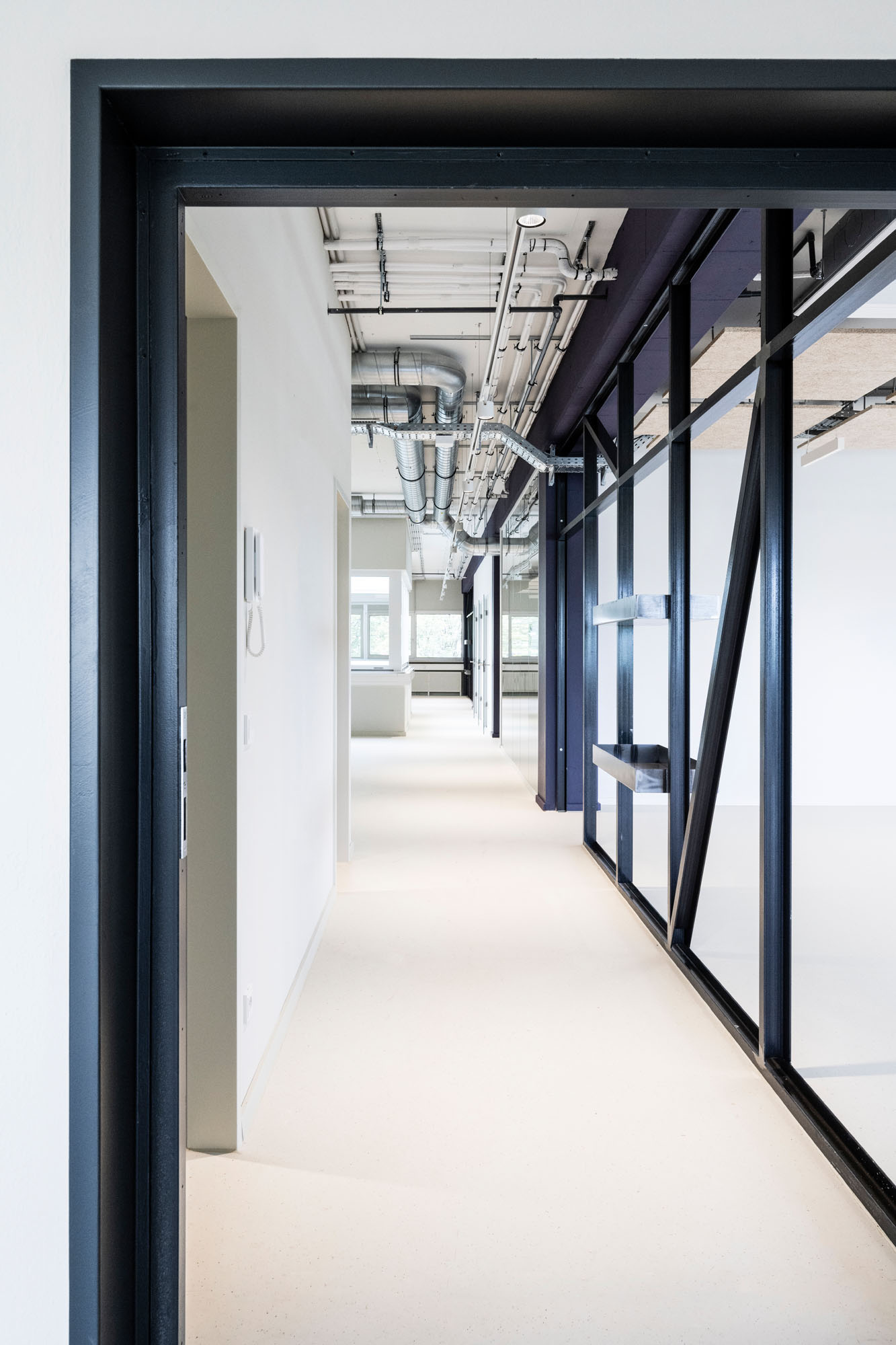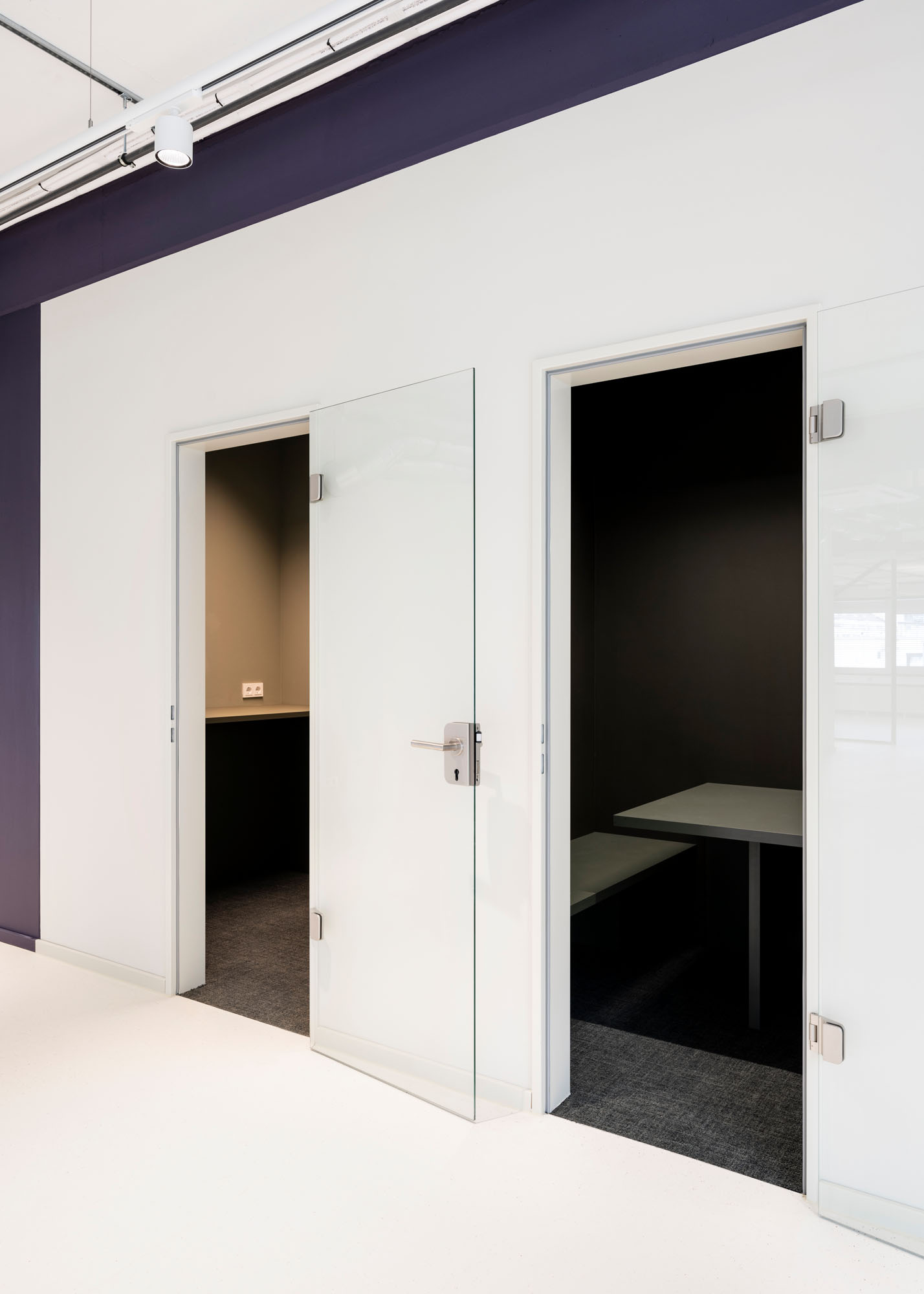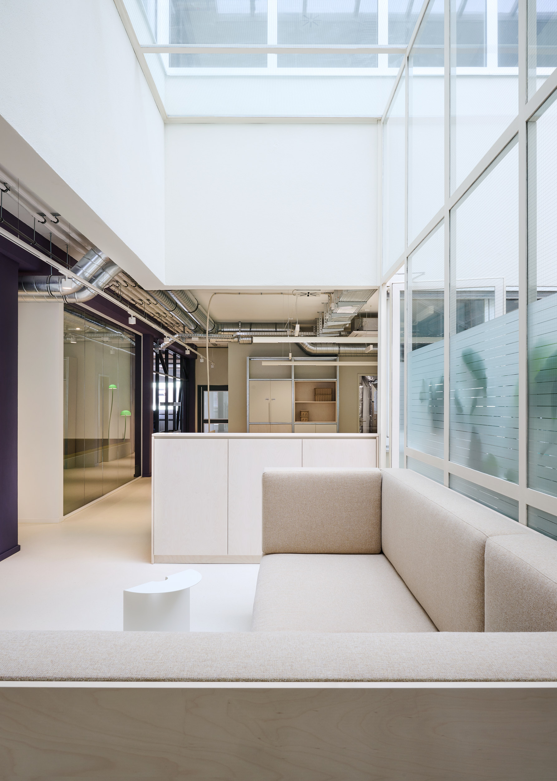 Stahl-Trennelemente strukturieren den Großraum und gliedern ihn in sinnvolle Einheiten. Open Space mit fließenden Übergängen zu den verschiedenen Arbeitsbereichen. Verschieden große und gestaltete Projekt- und Besprechungsräume. Rückzugsbereiche für konzentriertes Arbeiten – Think Tanks. Kreativ gestaltete Loungebereiche mit flexiblem Mobiliar. Große Fensterflächen und ein innenliegender Lichthof sorgen für viel Licht und angenehmen Arbeitsatmosphäre.
