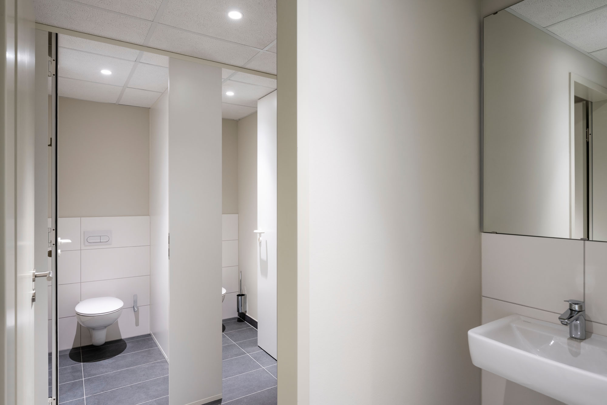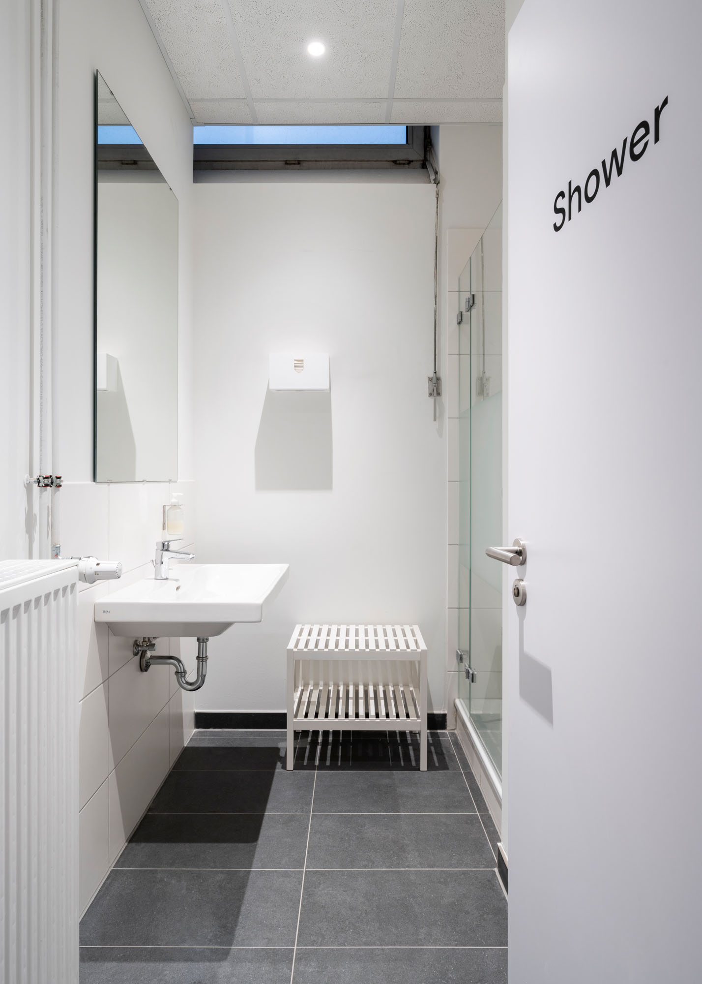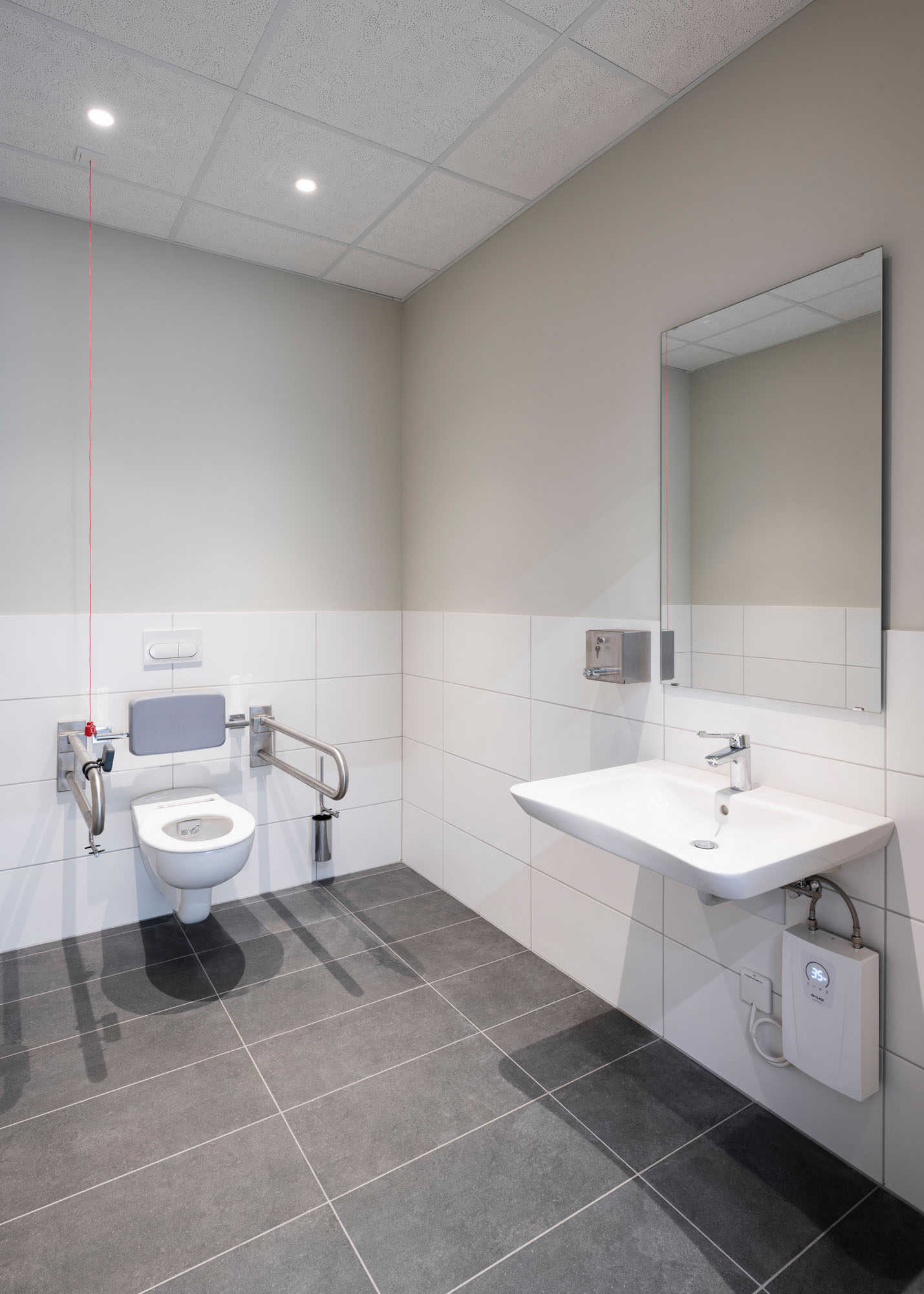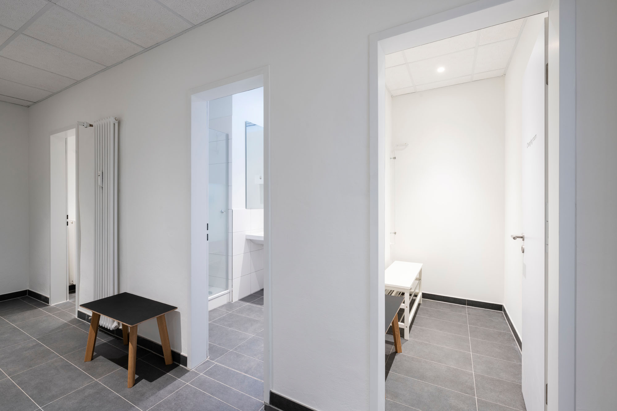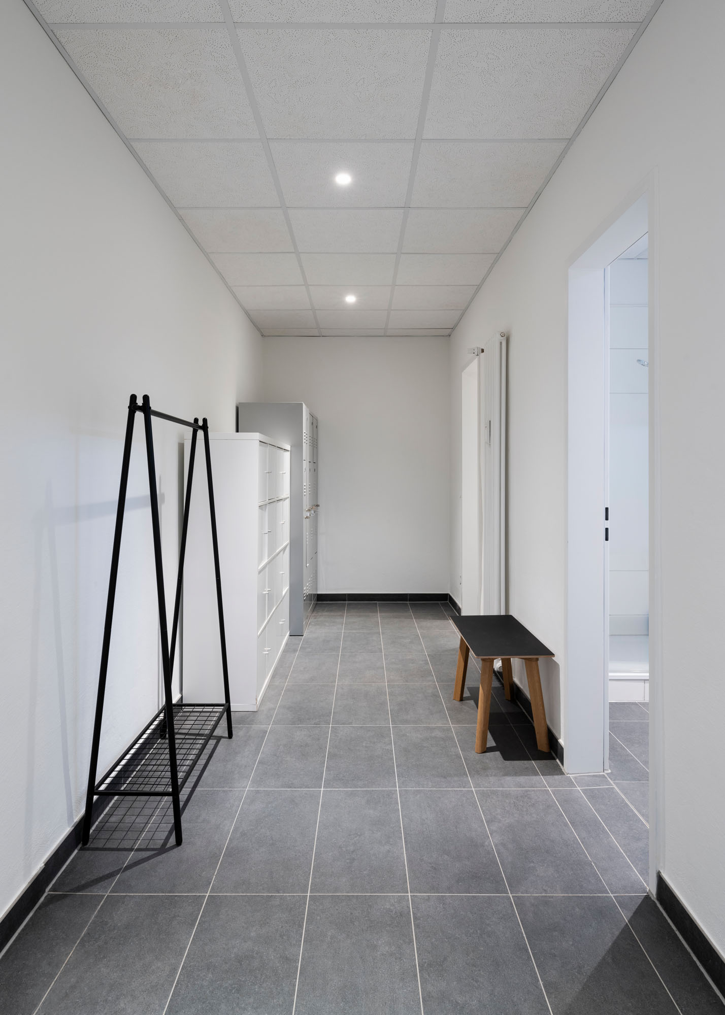 Ein besonderes Detail des Untergeschoss sind die modern ausgestatteten Umkleiden mit Schließfächern und die direkt anliegenden Sanitäranlagen mit Toiletten und Duschen.
